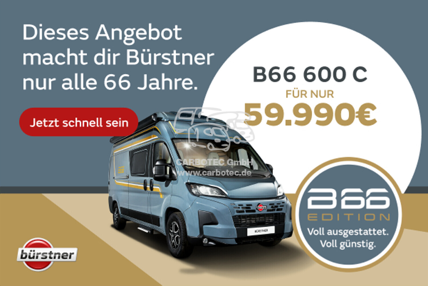 - Entdecke die neueste Innovation von Bürstner: Unsere exklusiven Jubiläumsmodelle ? nur für kurze Zeit erhältlich. Bürstner feiert Jubiläum und du profitierst davon! Mit der limitierten B66 Edition bieten wir dir ausgewählte Modelle mit umfassender Ausstattung zu einem unschlagbaren Preis. Egal ob Wohnmobil, Camper Van, Urban Camper oder Wohnwagen ? jedes Modell ist ein perfektes Gesamtpaket für entspannte Reisen. Dieses einmalige Angebot gibt es nur alle 66 Jahre. Jetzt entdecken und sichere Dir Deinen B66 bei uns.