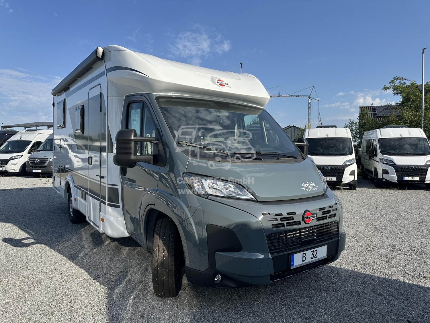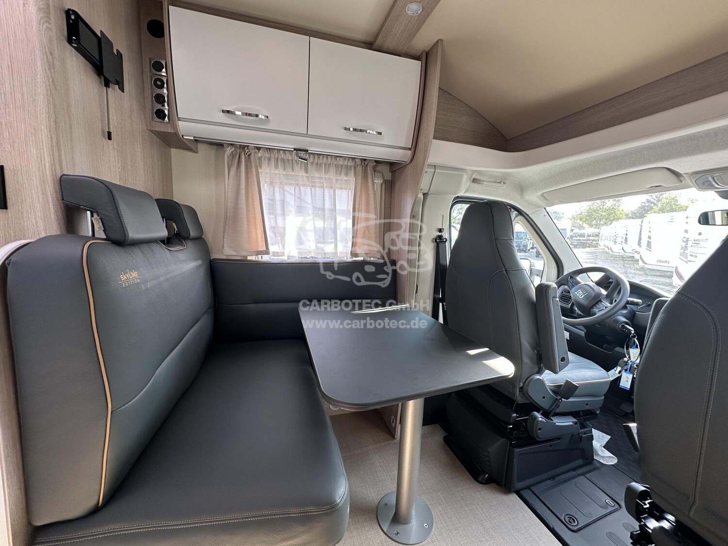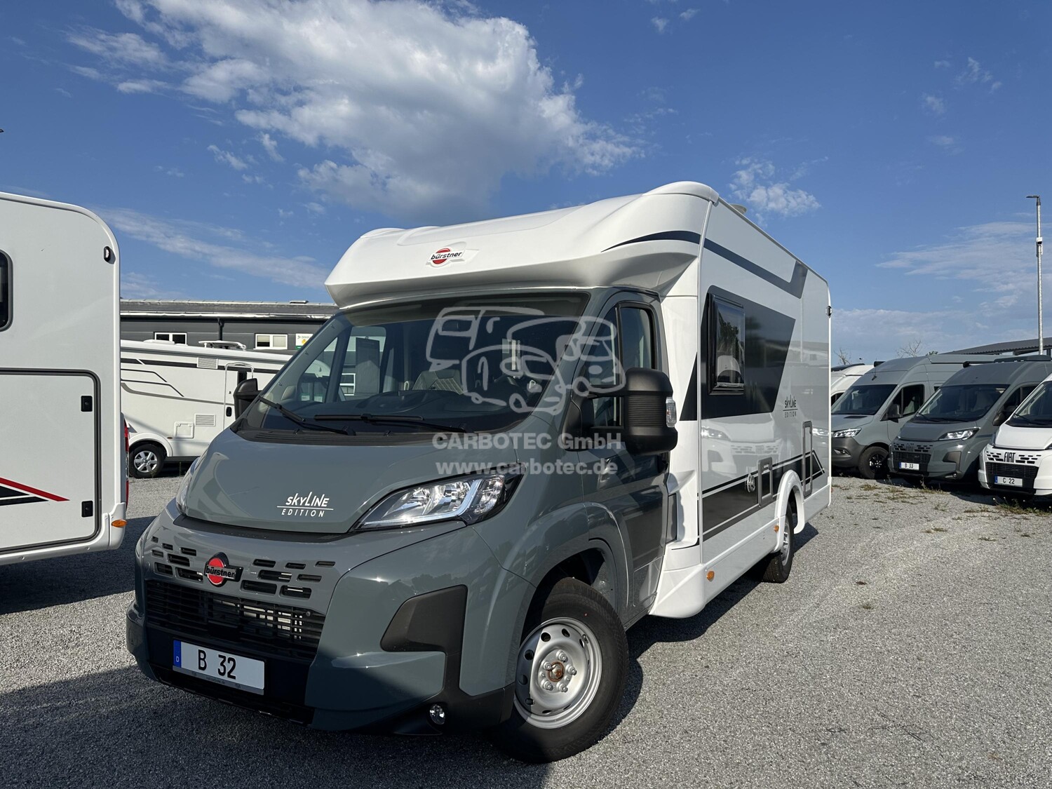 - (Bürstner SkyLine Edition ( Fiat Ducato Multijet 3-2,2 1- 140 Ps - Euro VI E inkl. 8-Gang Automatikgetriebe (Heavy Duty), Lackierung Lanzarote Grau (Fahrerhaus), Frontspoiler in Wagenfarbe lackiert, Coupe-Elnstleg, XL Aufbautür, Multimediastation inkl. Rückfahrkamera, Radiovorbereitung inkl. DAB+ und Antenne Im Außenspiegel, Markise, Polster mit Bestickung ?skyLine Edition? - Vollleder, Kompressorkühlschrank 131,5 L (davon 15 L Gefrierfach), Sitzgruppe in L-Form Inkl. Einsäulentischfuß, Tischplatte in alle Richtungen verschiebbar, SAT-Anlage Teleco HD Telesat 65 cm, Halterung für Flachbildschirm, Zusatzpolster Umbau Einzelbetten zu Doppelbett, Fahrerhaus Faltverdunkelung, GFK Unterboden, Cap-Holder, Tagfahrlicht, l6 ZolI Felgen mit Ganzjahresreifen)