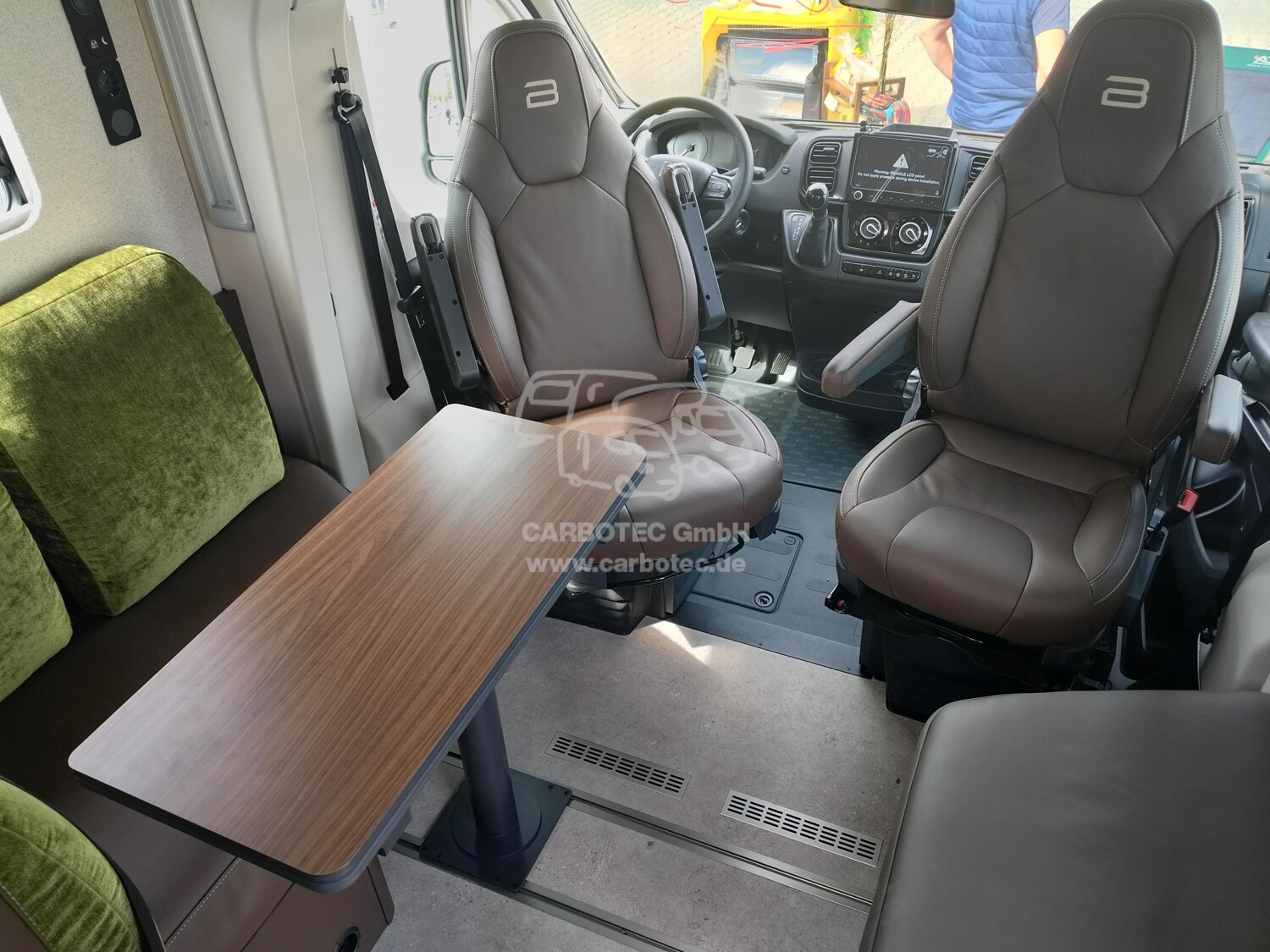 - Sofa Fahrerseite zur L-Sitzbank umbaubar (4 Gurtsitze gesamt), inkl. klappbarer Tischplatte und schiebbarem Tisch durch Bodenschienensystem