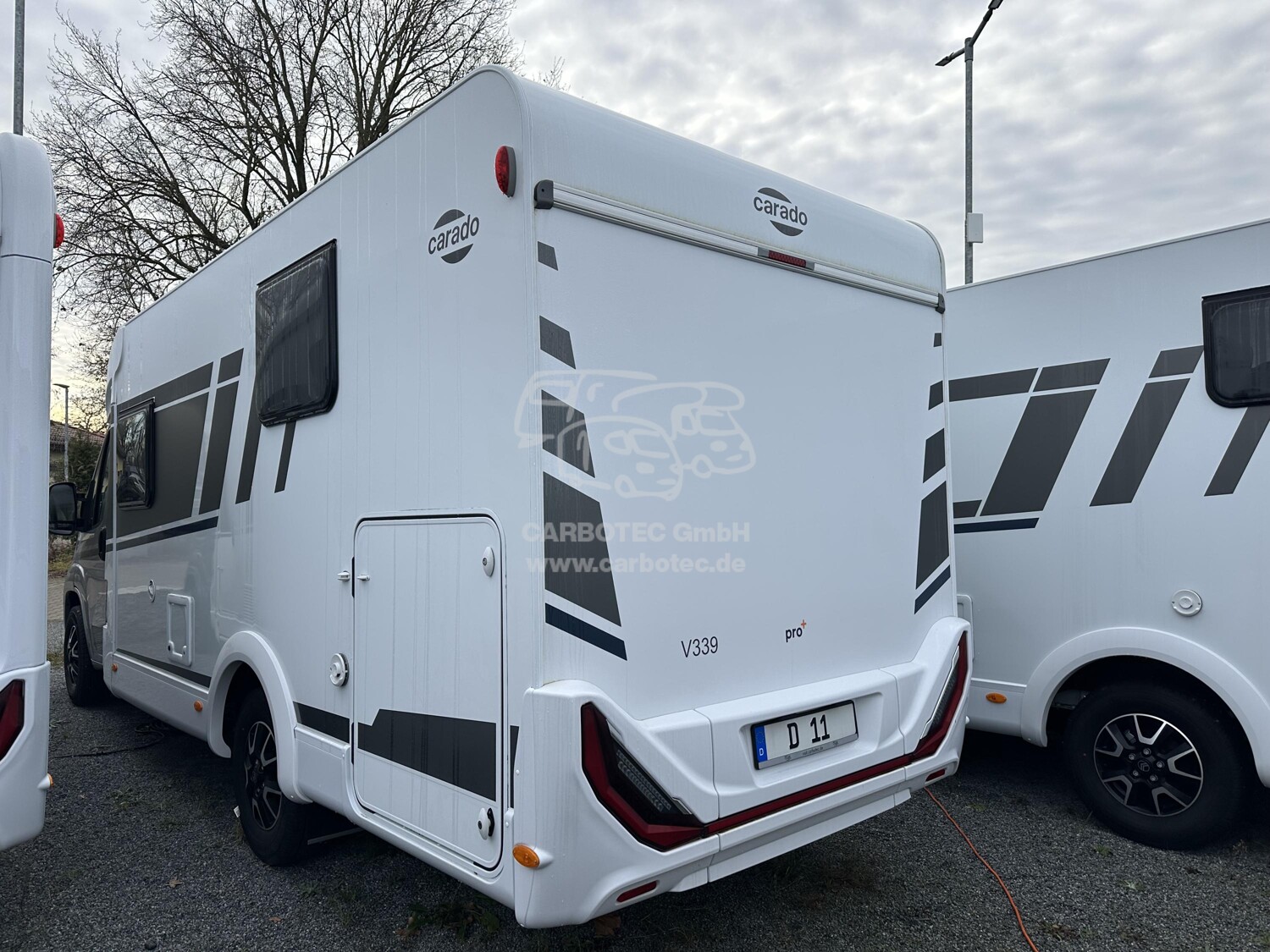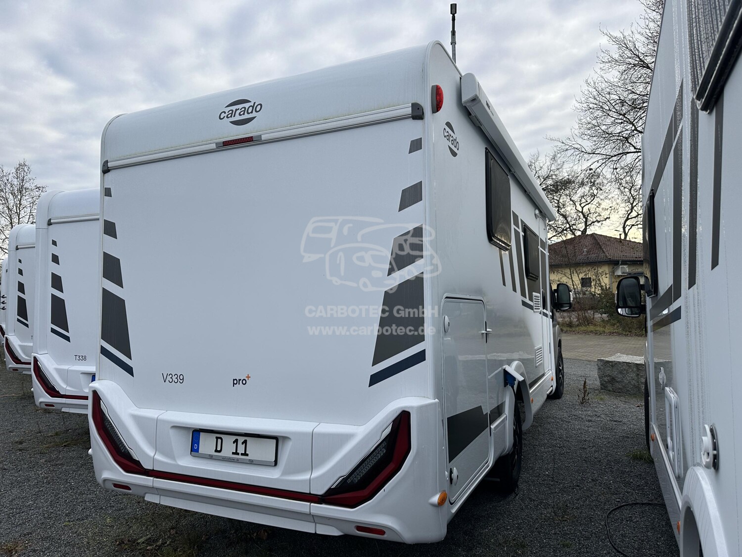 - pro+ Paket V339 (Optik Paket 1 | Stoßfänger lackiert, Optik Paket 2 | Alufelgen, Basic Paket, Chassisfarbe Artense Grau Metallic, Faltverdunkelung Fahrerhaus, Fenster in Fronthaube, Sonderfarbe Dachstauschrankklappen und Türen in Cosy White, Beklebung pro+, Markise 4 m, TV Paket (22" Smart-TV & Halter | Sat-Antenne Flatsat Classic 65), Abwassertank isoliert)