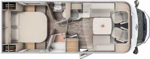 - pro+ Paket T459 (Chassisfarbe Artense Grau Metallic, Faltverdunkelung Fahrerhaus, Fenster in Fronthaube, Großer Kühlschrank 156 l mit separatem Frosterfach 29 l, Abwassertank isoliert, Markise 4,5 m, Rahmenfenster, Design Applikation Heck, Beklebung pro+)