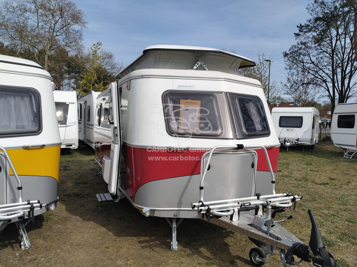 - Tango Red Edition (Seitenwände, Bug und Heck in Glattblech, Farbe White Tango Red, Stoffkombination Tulsa für Ausstattungslinie Urban, Möbeldekor Tindari, Chrompaket mit Außenanbauteilen in Chrom und Radlaufblende sowie Rückleuchten in Retrodesign, Leichtmetallfelgen ERIBA 5-Stern-Doppelspeiche, anthrazit, Steinschlagschutzblech, Bumper aus Edelstahl, Ambientelicht XL mit indirektem Licht oberhalb der Dachstauschränke und zwei zusätzliche ERIBA Multifunktions-Akkuleuchten, 2 Kissen mit Bezug)