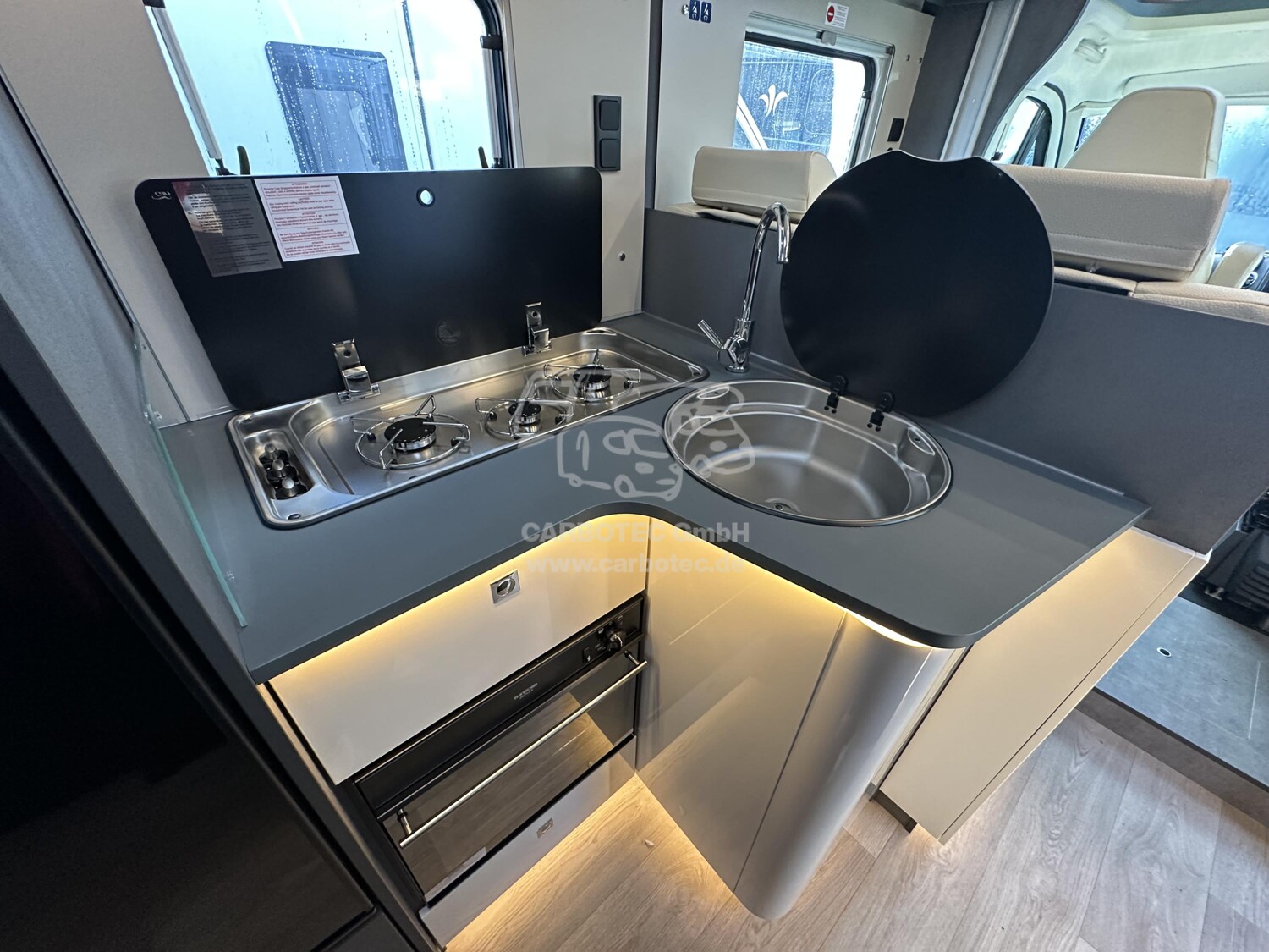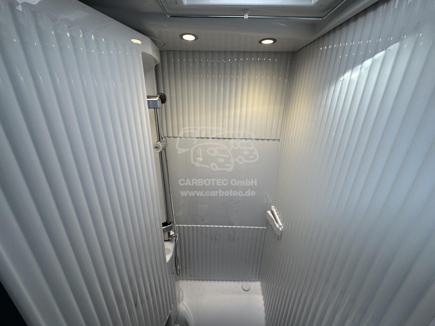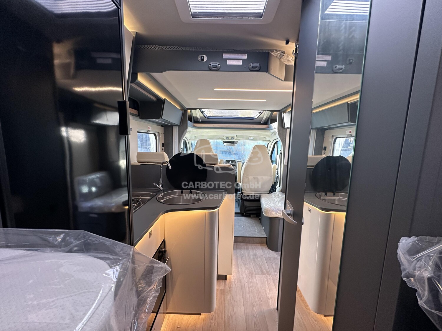 - Komfort Paket Kosmo L (Duscheinlage aus Holz, Fahrerhausteppich, Dunstabzugshaube, Isolierter Abwassertank, Beheizter Abwassertank, T-Haube mit Skyview zum Öffnen, Schlafzimmerwände in Eco-Leder verkleidet, Ausziehkörbe und -schränke in der Küche, Premium XL-Aufbautür, mit Fernbedienung, Zentralverriegelung, Fenster, Verdunkelung, Ablagefach und Gasdruckstoßdämpfer, Vorbereitung Rückfahrkamera, Auf den Wohnraum abgestimmte Sitzbezüge)