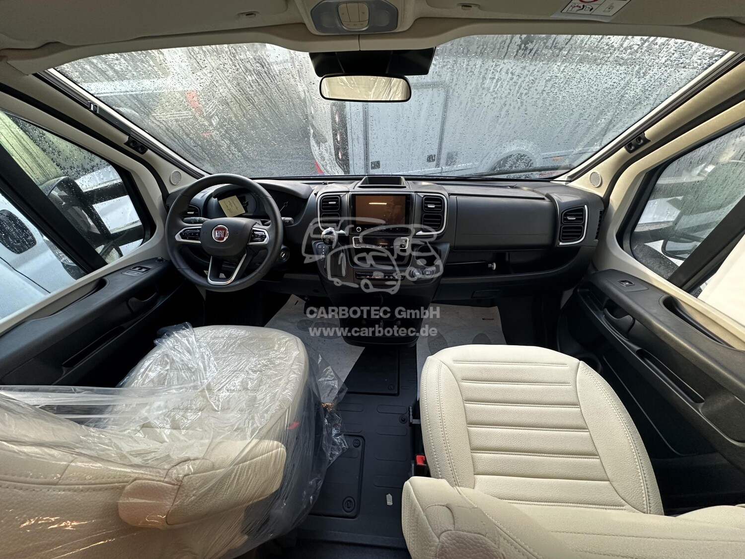 - Chassis Design Paket (Kühlergrill mit schwarzem Designrahmen, Lenkrad und Schaltknauf in Echtleder, Scheinwerfer mit schwarzem Rahmendesign, Armaturenbrettveredlung mit Techno-Trim Design, Fiat-Originalteil)