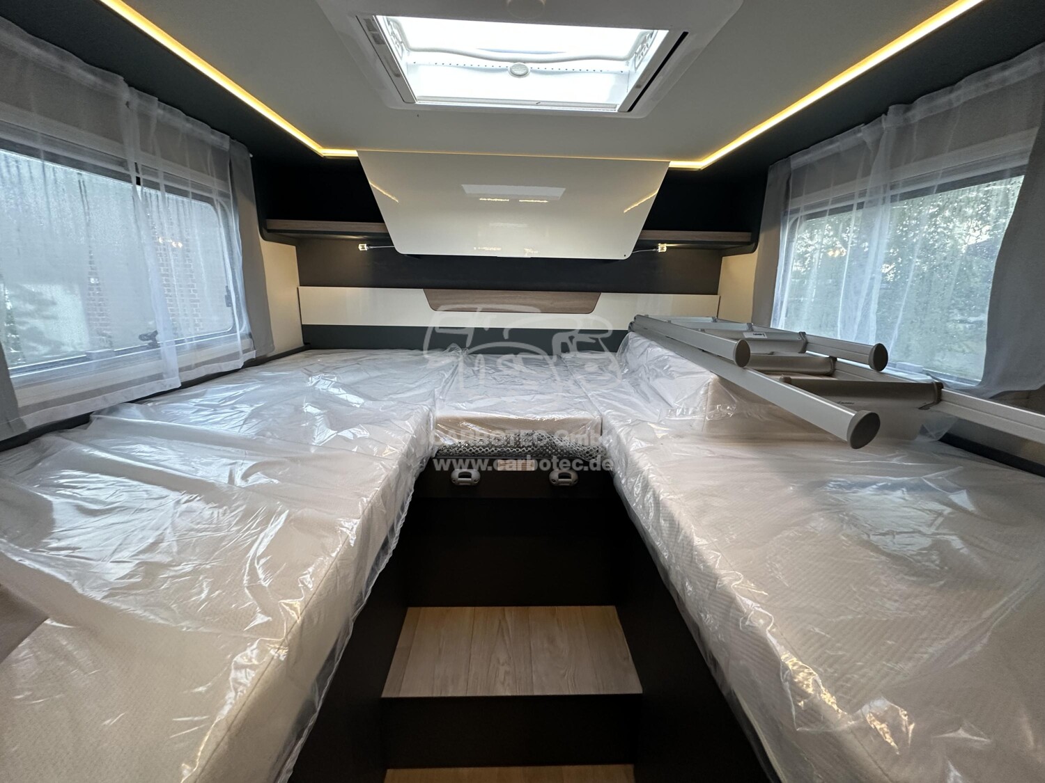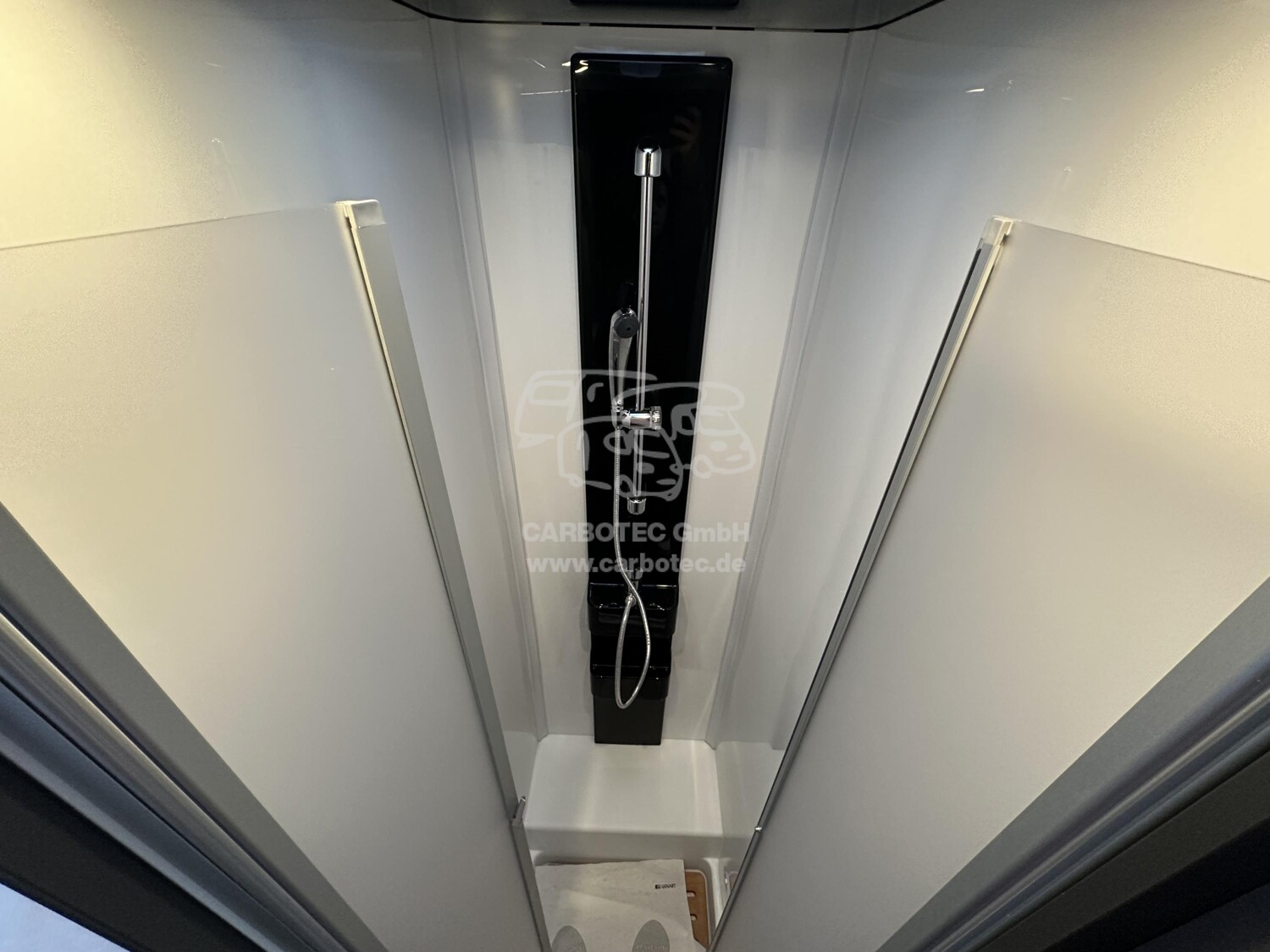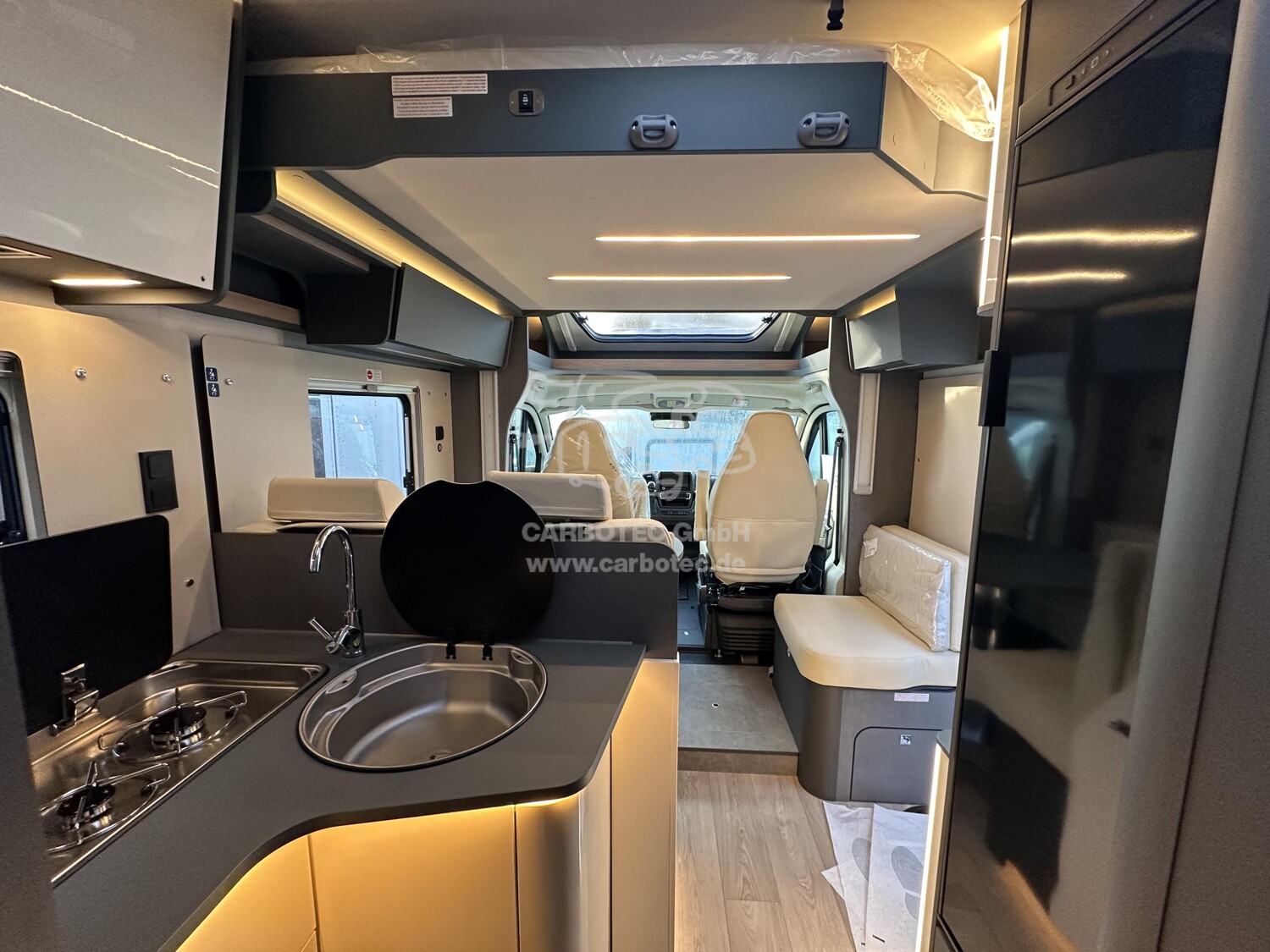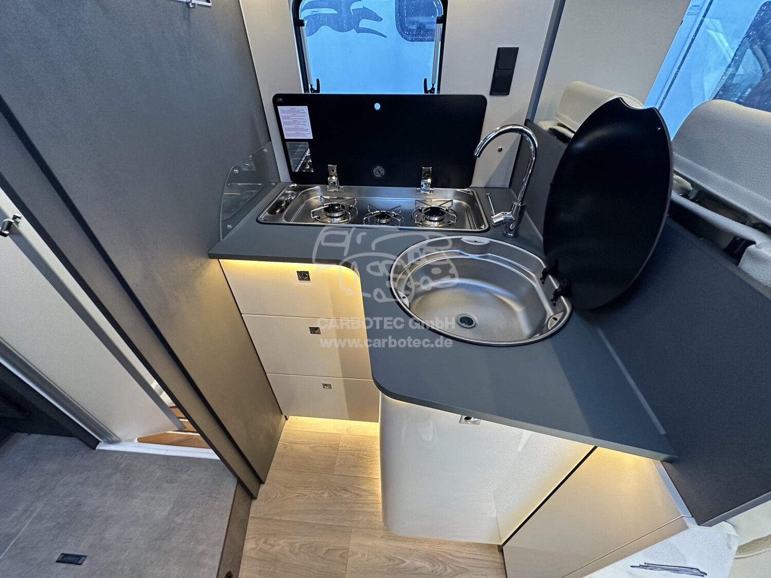 - Komfort Paket Kosmo L (Duscheinlage aus Holz, Fahrerhausteppich, Dunstabzugshaube, Isolierter Abwassertank, Beheizter Abwassertank, T-Haube mit Skyview zum Öffnen, Schlafzimmerwände in Eco-Leder verkleidet, Ausziehkörbe und -schränke in der Küche, Premium XL-Aufbautür, mit Fernbedienung, Zentralverriegelung, Fenster, Verdunkelung, Ablagefach und Gasdruckstoßdämpfer, Vorbereitung Rückfahrkamera, Auf den Wohnraum abgestimmte Sitzbezüge)